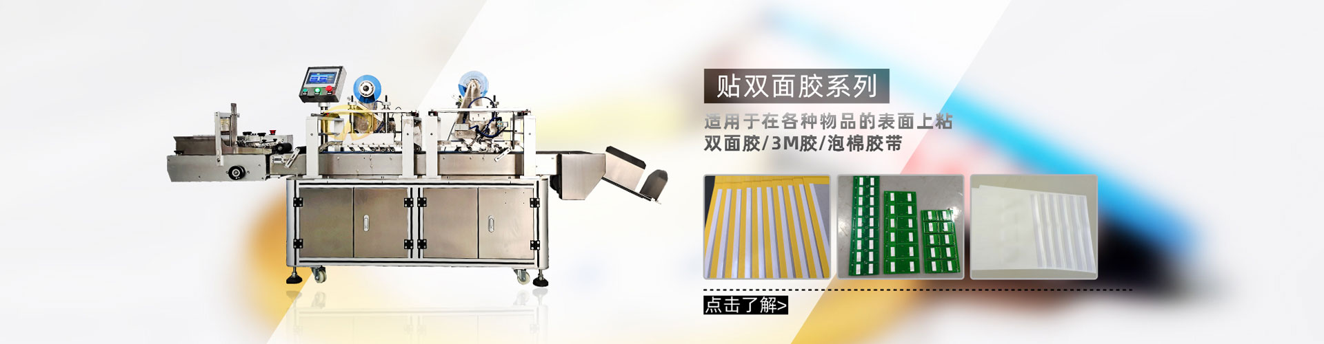 • 貼膠帶機 • 打印貼標簽機 • 行業專機 • 貼海綿機 • 平面貼標簽機 • 圓瓶貼標簽機 • 側面貼標簽機 • 卷膜貼標簽機 • 視覺檢測 • 產線配套 • 組裝機
